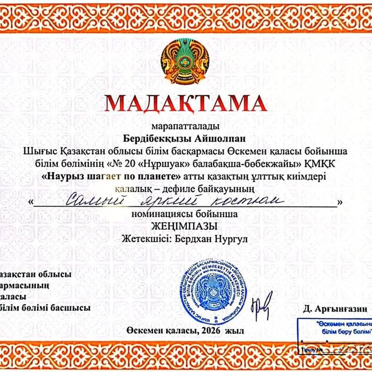 «Наурыз шагает по планете» атты қазақтың ұлттық киімдері қалалық дефиле байқауына белсенді қатысып, ұлттық мәдениетімізді насихаттауда ерекше өнері мен шығармашылығын көрсетіп, «Ең әсем (немесе Ең жарқын) ұлттық костюм» номинациясы бойынша ЖЕҢІМПАЗ атанғаны үшін марапатталады.